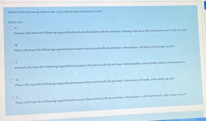 Structures unique to animal cells. Most plant cells have a single large vacuole. Nov 12, 2019 · chloroplasts are not present in a plant's root cells and the cells inside its stem. Unlike the eukaryotic cells of plants and fungi, animal cells do not have a cell wall. Animal cells have one or more small vacuoles, whereas plant cells have one large central vacuole that can take up to 90% of cell volume.